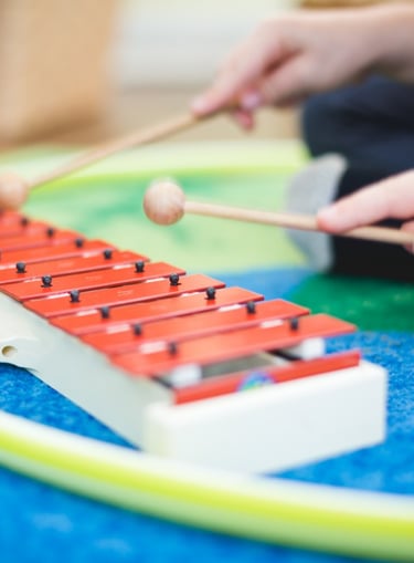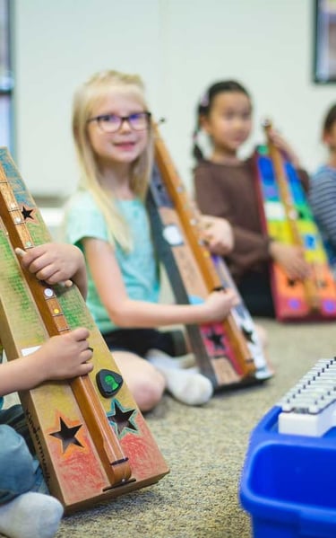 A joyful, encouraging team environment can help your child build a true love for music. In Musicians Year 1, children begin to read, write, and play simple music patterns using the glockenspiel. Classes focus on listening, rhythm, and teamwork - laying a joyful foundations for lifelong musicianship. Weekly at-home activities and instrument practice are essential for success in this class. Caregivers join a portion of each class to participate in the music-making.